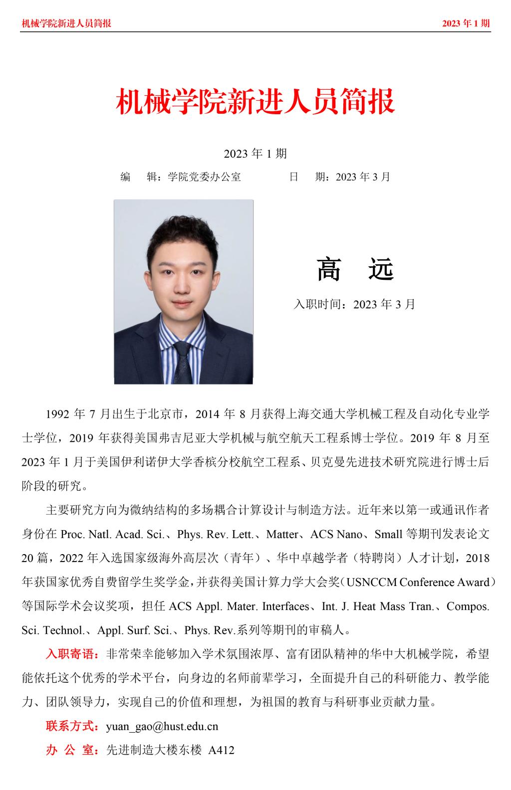 新进人员简报丨高远(智能制造装备与技术全国重点实验室)