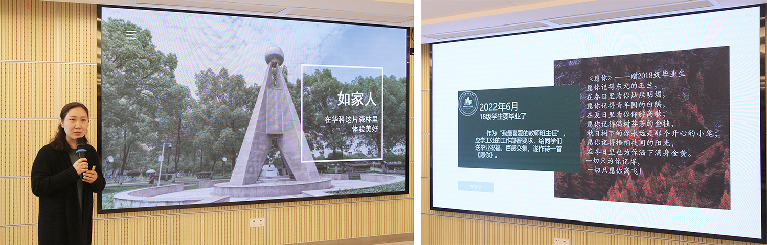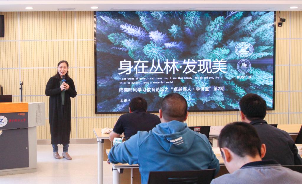 曹颖以“身在丛林·发现美”为主题,回顾了自己在这林木葱郁,碧草如茵的森林大学中的点点滴滴。她说到,作为老师不能只和员工们分享阳光、美好的事物,当员工们遇见困难与挫折时,我们更应该是他们强劲的后盾。她会继续和员工们如家人般在华科大这片森林里体验美好。