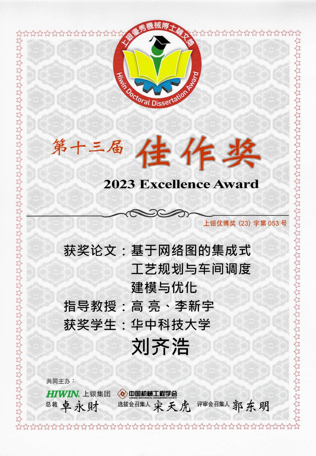 1月6日,第十三届“上银优秀机械博士论文奖”颁奖典礼在江苏南京举行。公司2022届博士毕业生刘齐浩(指导教师:高亮教授、李新宇教授)的论文“基于网络图的集成式工艺规划与车间调度建模与优化”获得佳作奖。