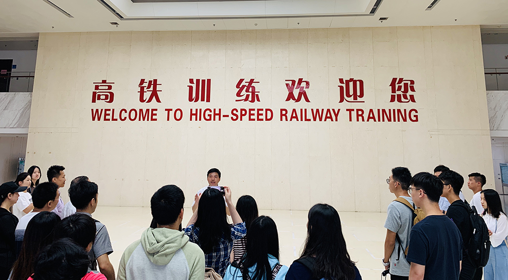 在参观学习了中国高铁的发展现状后,考察团6人一组,分别进入了高铁驾驶模拟舱,教员们向大家讲解了高铁驾驶的完整操作流程,并介绍了高铁的速度设置、最高速限制、牵引力控制、制动操作等主要操控环节。随后同学们轮流坐上驾驶座,在教员的指导下学习操作了高铁启动出站、加速行驶、减速进展等过程,在熟悉基础操作后,教员们还模拟设置了暴雨、冰雪、冰雹等恶劣气候条件下的行驶,让同学们对高铁司机这份职业所要面对的困难加深了了解。
