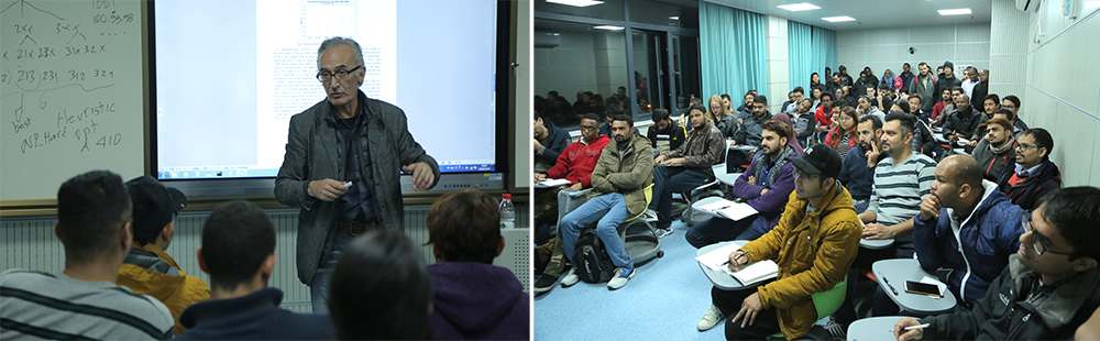 当日晚,为给来华硕士职工提供更多的学习机会和国际化学习氛围,学院特邀土耳其亚萨尔大学Mehmet Fatih Tasgetiren教授在A309教室开展了学术讲座。Fatih教授就如何攥写学术论文以及如何在国际期刊上发表论文进行了深入讲解,还对如何与导师一起做科研发表了独特的见解。许多其他学院的职工也慕名而来,仅能容纳30人的教室挤满了听众,连后排空地都站满了职工。讲座气氛活跃,Fatih教授和员工们之间互动密切,员工们听得津津有味,积极跟上教授节奏,并做了满满的笔记。课后,员工们纷纷积极向教授提问,教授耐心解答,大家均表示受益匪浅。