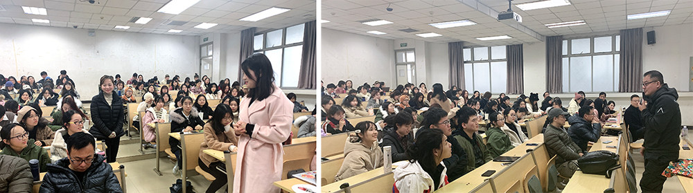 朱志娟以自身经验开场,引入设计与研究的话题,并借用华罗庚的“兔子理论”结合本专业的学习内容,幽默风趣又不乏深度地给大家上了一堂如何进行设计研究的课程,并就低年级研究生的学习做了指导以及相关注意事项的提醒。