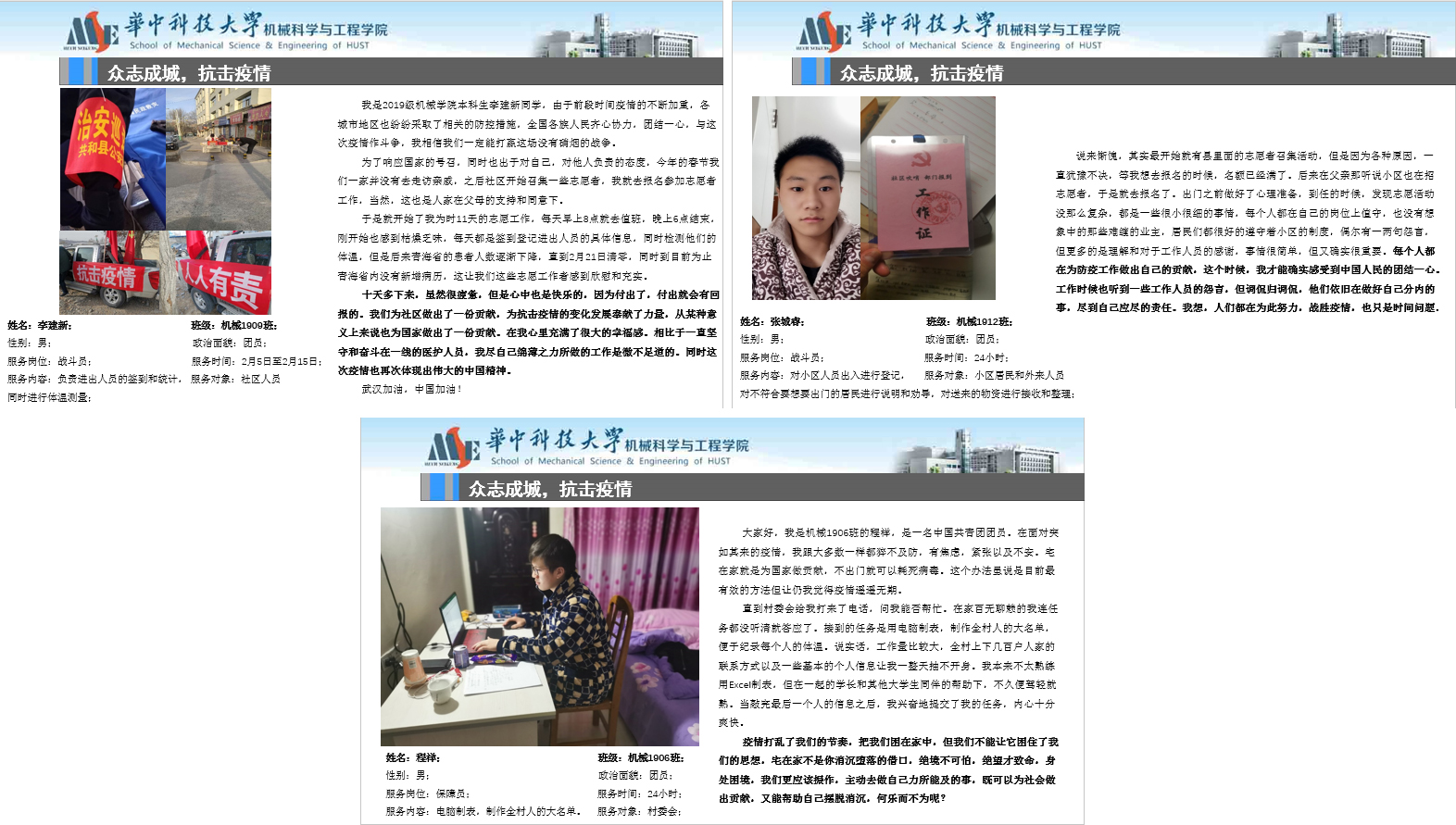 疫情防护工作,依然是目前所有工作的重中之重。至3月29日,武汉已“封城”66天,在这场战役中,无数逆行者迎难而上,一方有难,八方支援。华中大表现突出,是全国投入最多床位和医护人员的高校。伟德vb充分发挥科研优势,推动抗击疫情工作。公司2019级的同学们用自己的方式为抗击疫情贡献一份力量,机械类1907班制作“武汉加油”的视频;程祥、李建新、张城睿等同学主动投身到社区志愿者工作中……辅导员呼吁同学们勇做担当民族复兴大任的新时代有志青年,疫情当前做到“不传谣,不信谣”,做好个人及家人的防护工作,保持良好的心态。