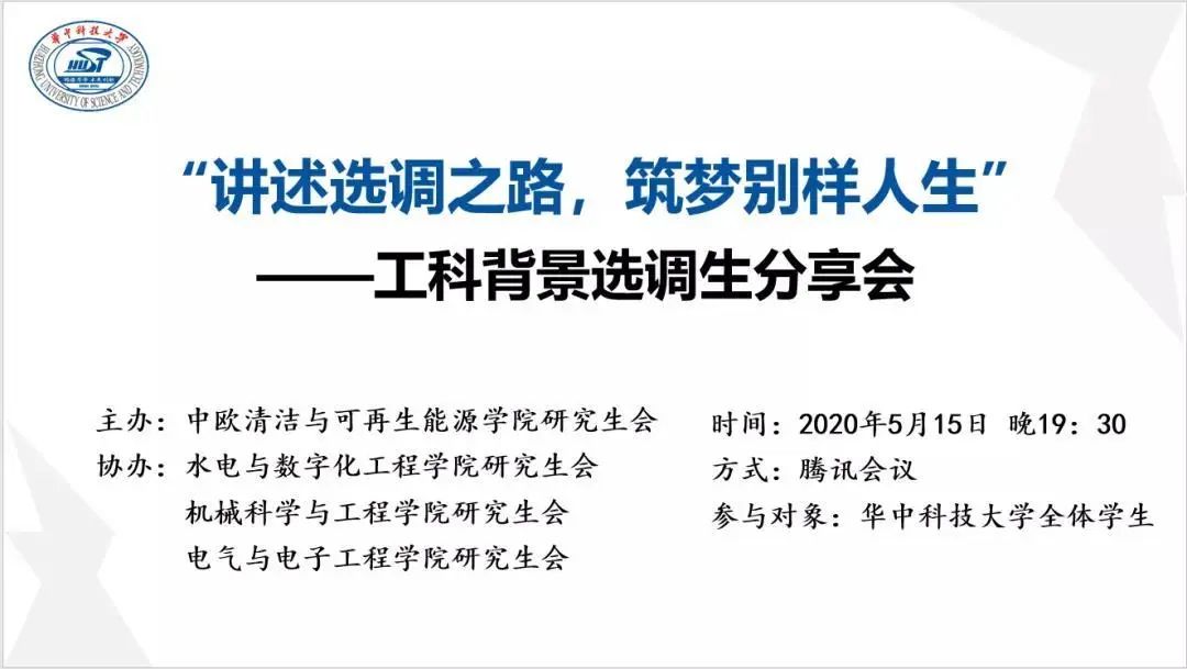 5月15日晚7:30,由中欧清洁与可再生能源学院研究生会主办,电气与电子工程学院研究生会、伟德vb研究生会、水电与数字化工程学院研究生会协办的“工科背景选调生分享会”在腾讯会议平台顺利举行。本次活动邀请了公司党委研究生工作部郑名扬老师、选调生员工、准选调生为我们讲解公司选调生政策、选调生工作日常以及笔试面试经验。中欧清洁与可再生能源学院辅导员梁媛媛参加活动。