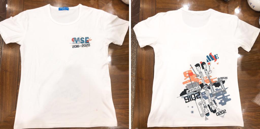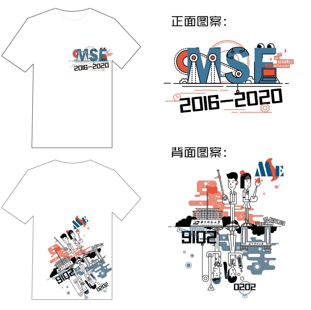 文化衫中主要融入了元素,如学校南一门、老电影场等标志性的校园场景,并在其中强调了2016级和MSE(School of Mechanical Science and Engineering缩写)字样,还包括了体现不同专业性质的元素(学习工具、课程内容、使用的各类软件等)来突出学院本身的特色。