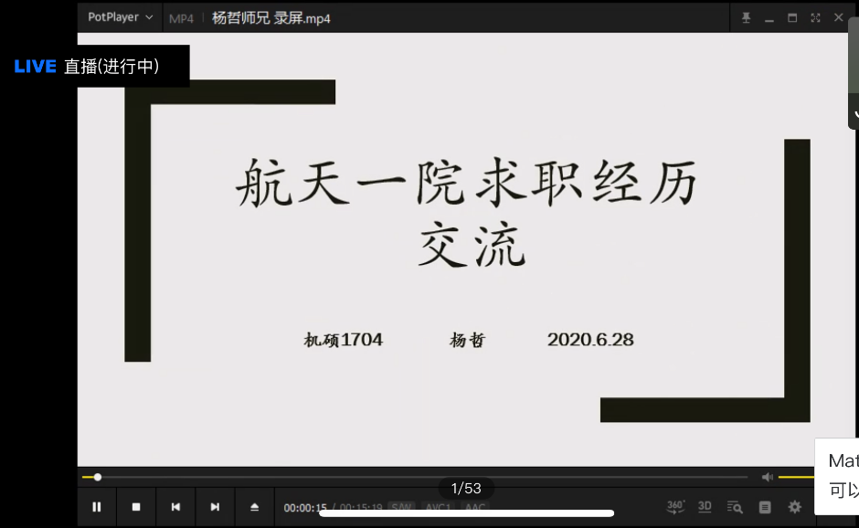 杨哲被北京航天一院录取,他在录屏中介绍了航天研究所的求职情况,拓展了同学们的就业面。