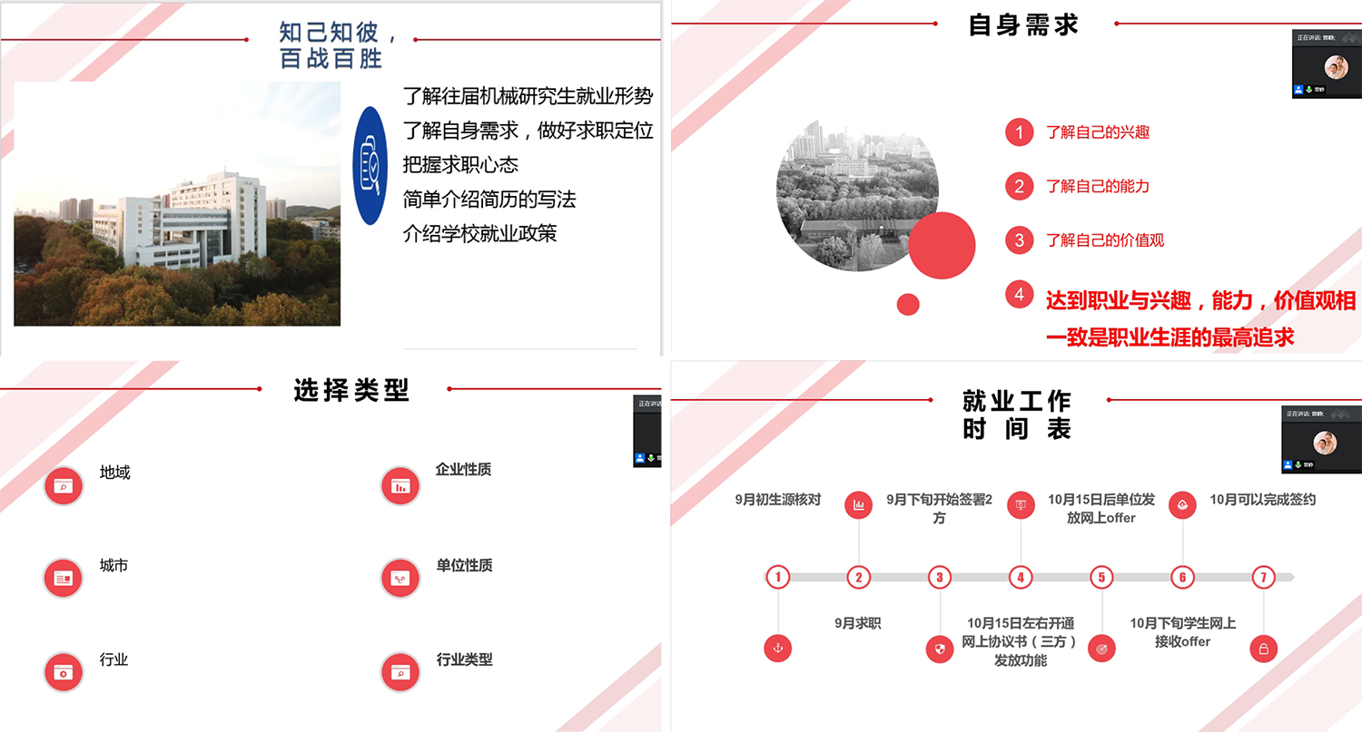 曾峥针对就业时间工作表、线下就业流程、就业工作所需的基本信息等注意事项进行了分享。同时,结合全球疫情、中美贸易战、校园封闭管理对就业情况的影响给出分析和建议,希望同学们保持谨慎态度、乐观心态、做好准备,对自己充满自信!