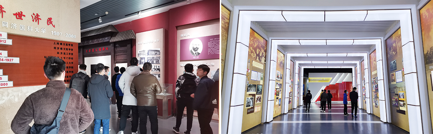 在同济医学院展区看到在百年艰苦曲折的发展历程中始终和国运紧密相连。始于清末,经过战乱的洗礼,新中国成立后为了国家发展西迁武汉。沿着时光长廊走去,同济师生辗转迁徙,风雨中同舟共济,艰苦奋斗的画卷一幕幕浮现。