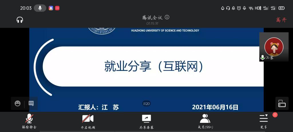 6月16日晚上7点,“信息化前沿”专场就业分享会在线上举行,分享嘉宾为2018级硕士毕业生张士羿、江苏、徐毅之和2020届毕业生员工尹洋。张士羿结合自己的经历分享了找工作前的准备工作、面试技巧及就业选择经验;江苏分享了收集求职信息、投递简历及总结面试经验的技巧;徐毅之强调了选择的重要性,并结合自己的求职历程提供了建议;尹洋分享了求职准备工作及offer选择的相关心得。